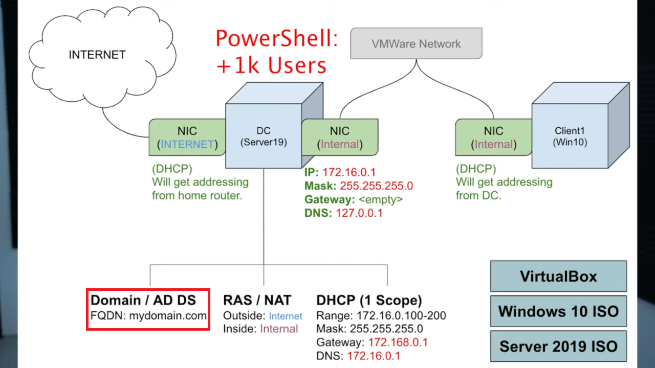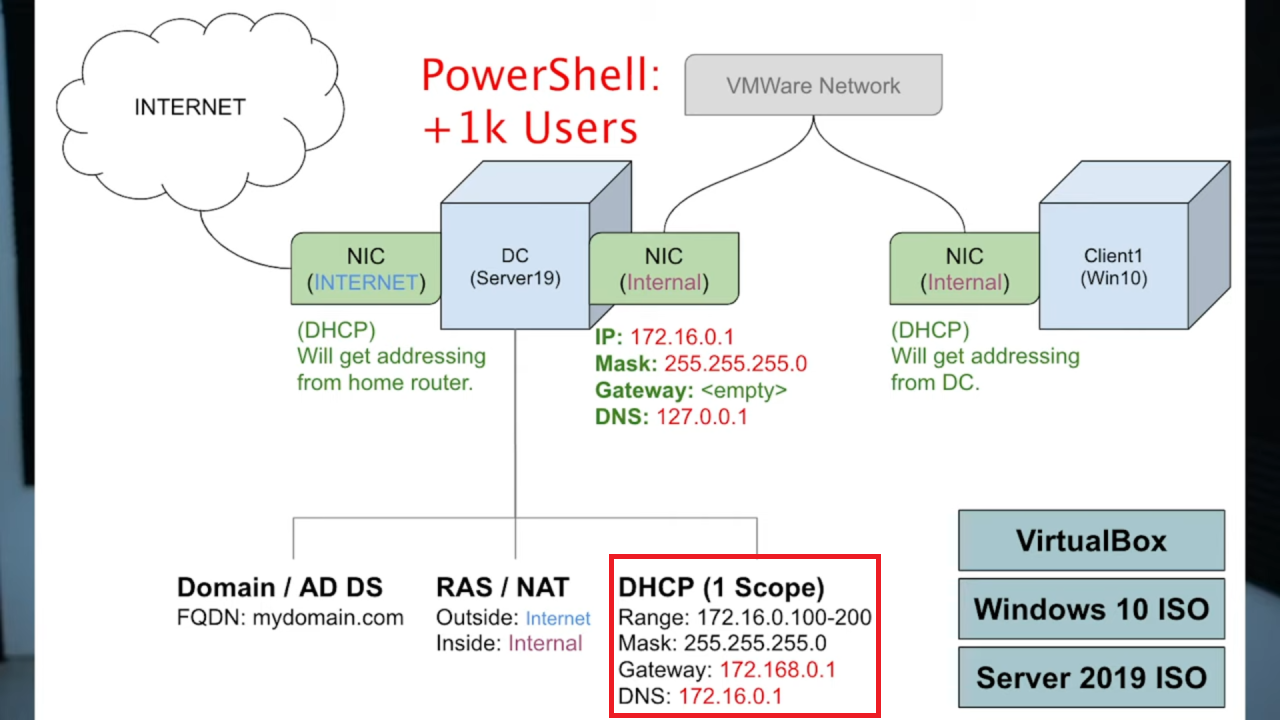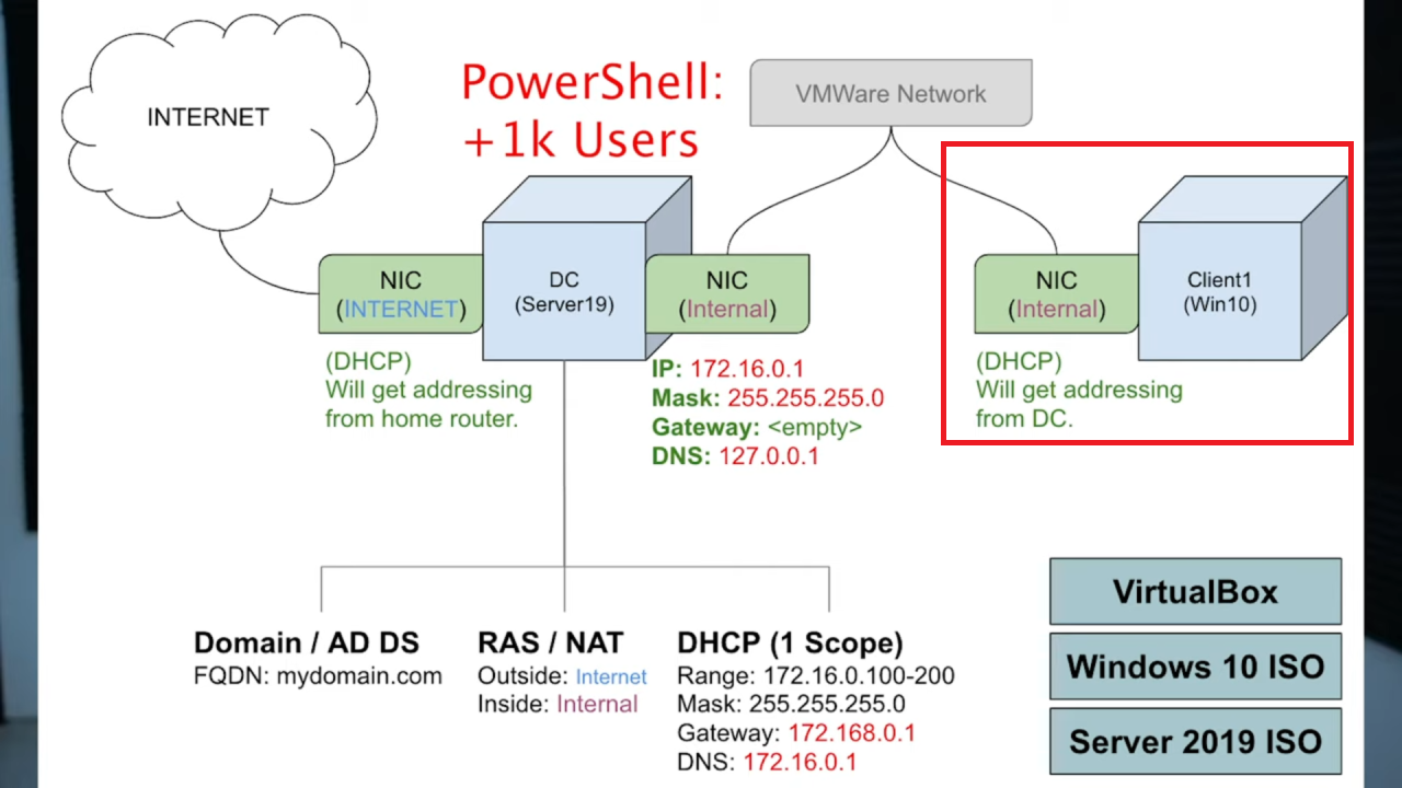 Last thing is to create this virtual lab is to install a virtual machine with a private client using an internal NIC that is getting an IP address from the DHCP server of the domain controller.