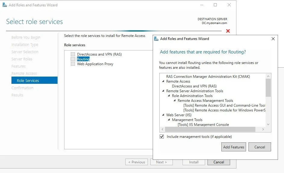 For that we have to go back to add roles and features. Select in roles Remot Access.