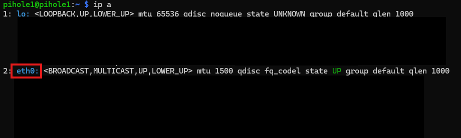 Next thing is to get the interface of the main pihole for this project, use the ip a command to get the name of the interface. This is going to be needed for our configuration file. My interface name is eth0.
