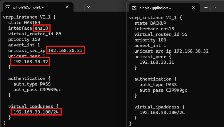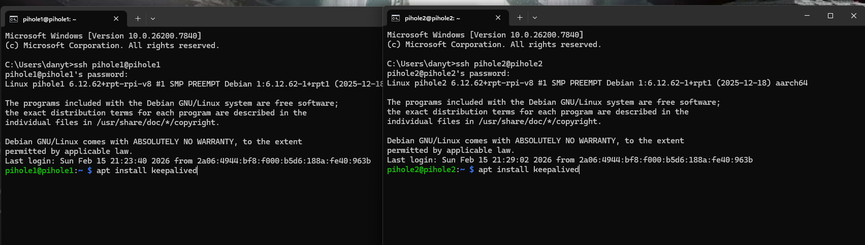 A single Pi-hole creates a single point of failure. If it goes offline, DNS resolution across the network stops working. To prevent this, I used Keepalived with VRRP to create a shared virtual IP address between both devices.