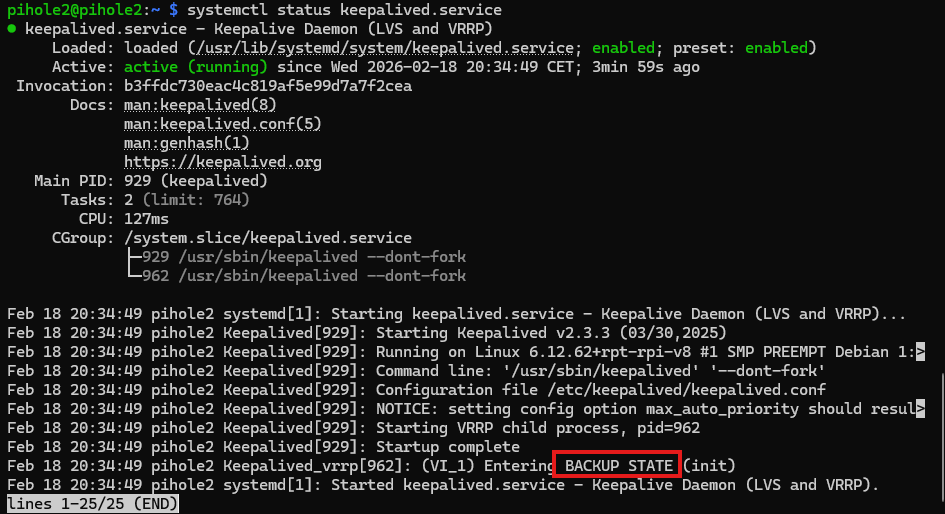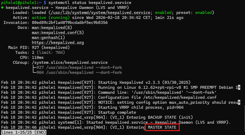 One Pi-hole acts as the master and handles all DNS traffic, while the second remains as a backup. If the master fails, the virtual IP automatically moves to the backup, ensuring uninterrupted DNS service.