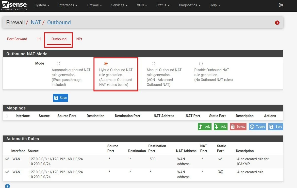 I won’t show the whole configurantion since I already did that in PFSense Lab Series 2. What I didn’t cover in the other two projects about PFSense was how to create a connection to the internet that is outgoing so the wireguard peer can also have access to the network through the home network where he connected with Wireguard VPN.