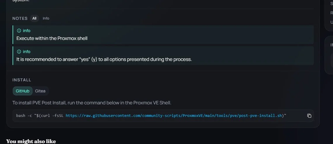 Copy the line bash -c "$(curl -fsSL https://raw.githubusercontent.com/community-scripts/ProxmoxVE/main/tools/pve/post-pve-install.sh)"