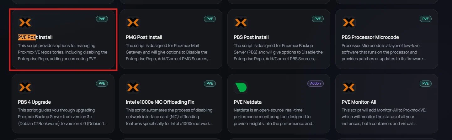 Then go to the website https://community-scripts.org/category/proxmox-and-virtualization and find the PVE Post Install to be able to get the PVE packages.