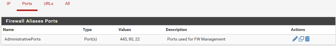 First under Aliases we define the three ports 443, 80 and 22 that are going to be used to manage the firewall.