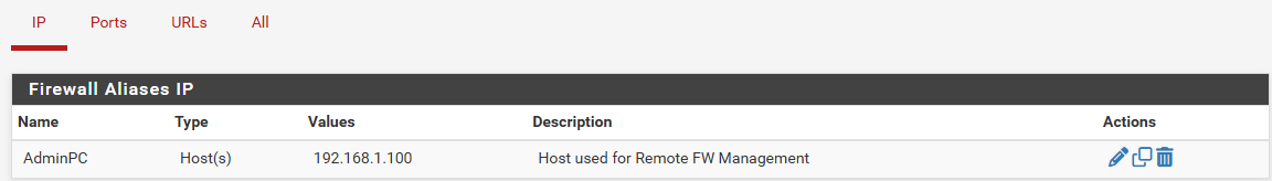 To assign the new IP address, go to Firewall → Aliases in the firewall settings. Click on edit the AdminPC alias.