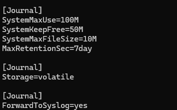 For a Raspberry Pi, these limits are beneficial because they prevent the SD card from filling up with excessive logs, which could otherwise lead to system instability or failures. By automatically rotating and deleting old logs, they also help reduce unnecessary write operations, extending the lifespan of the SD card. At the same time, the configuration ensures that recent logs remain available for troubleshooting and debugging, while protecting the system from runaway log generation caused by misconfigured or noisy services.